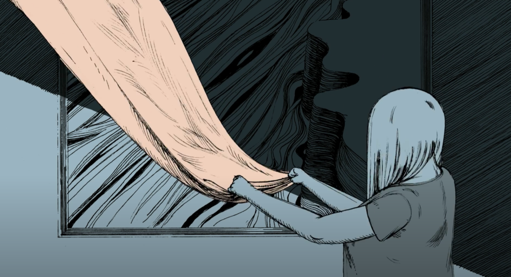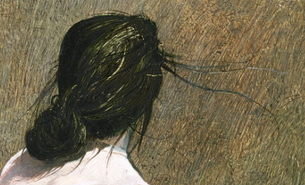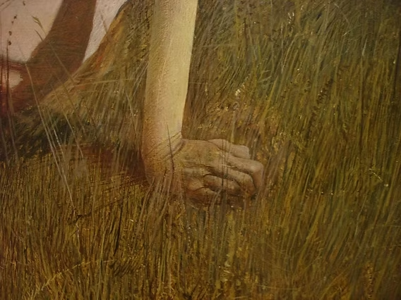 Tek tek çizilen otlar, pembe elbisedeki kırışıklıkar ve gölgeler, genç kadının saçlarının dağılışı fotoğraf gibi ama daha soğuk. Gerçekçiliği neredeyse sert.